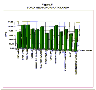 Las enfermedades con una edad media más elevada corresponden a las enfermedades genitourinarias (53.20 años), las endocrinas (53 años), las neoplasias (52.67 años) y las cardiocirculatorias (49.75 años), las de edades más bajas corresponden a las enfermedades respiratorias (35.56 años), infecciosas (36.75 años), y al grupo de otras patologías (36 años). (figura 5).