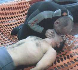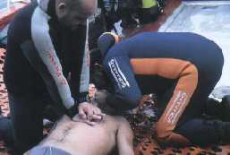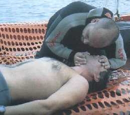 Abriremos la boca del paciente para ver si presenta materias extrañas en la boca (prótesis dentales sueltas, restos de vómitos u otros cuerpos extraños) y los limpiaremos con los dedos "en gancho" o mediante la aspiración Iniciaremos la ventilación artificial con el método del boca a boca. Para ello pinzaremos la nariz del paciente, sellaremos con nuestra boca la suya e insuflaremos el aire de nuestros pulmones lentamente, comprobando que su tórax asciende |