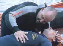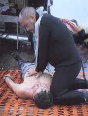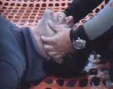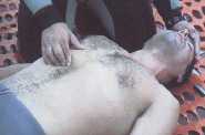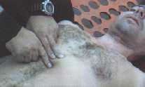 Seguidamente comprobaremos si el paciente respira colocándole la mano sobre las últimas costillas para sentir el movimiento, viendo si se produce elevación o descenso del tórax y oyendo si hay entrada o salida de aire. |