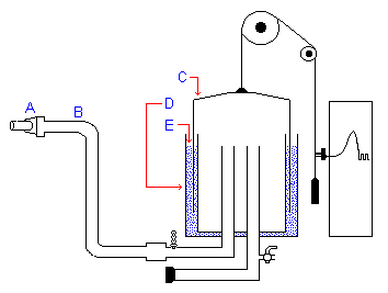 Figura 2. Espirómetro de agua. a) Boquilla. b) Tubo del espirómetro. c) Campana. d) Cilindro de doble pared. e) Agua para sellar la campana.