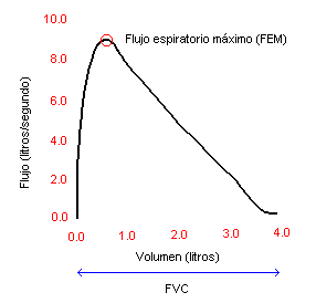 2. VOLUMEN ESPIRADO MÁXIMO EN EL PRIMER SEGUNDO DE LA ESPIRACIÓN FORZADA (FEV1 o VEMS): es el volumen de aire que se expulsa durante el primer segundo de la espiración forzada. Aunque se expresa como volumen (en ml), dado que se relaciona con el tiempo supone en la práctica una medida de flujo. Se considera normal si es mayor del 80% de su valor teórico.